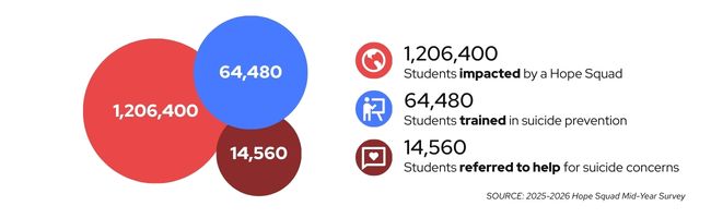 Since the start of the 2025-2026 school year, Hope Squad programming has reached an estimated 1,206,400 students through lessons, activities, and peer support initiatives. More than 64,480 trained Hope Squad Members are actively engaged nationwide, having received training in evidence-aligned gatekeeper skills that empower them to notice concerns, offer age-appropriate support, and connect peers to trusted adults.